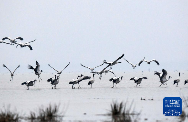 在草海栖息的国家一级保护动物黑颈鹤。新华社记者杨文斌 摄