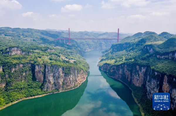 碧绿的乌江水与峡谷交相辉映,远处高桥飞架