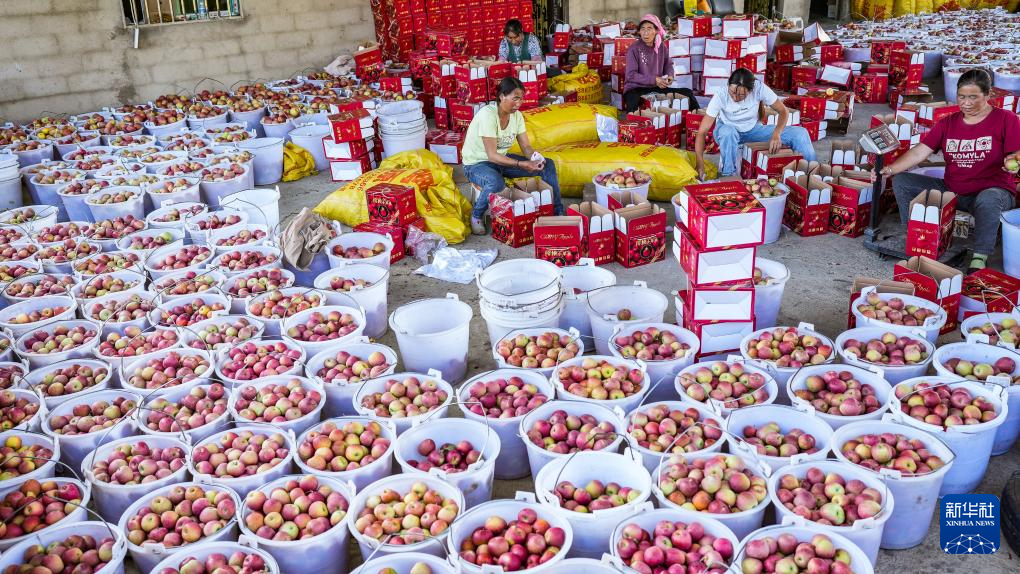 威宁彝族回族苗族自治县雪山镇谢家村村民将苹果分拣装箱(9月20日摄)。新华社记者 陶亮 摄