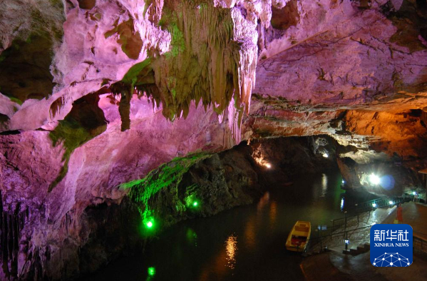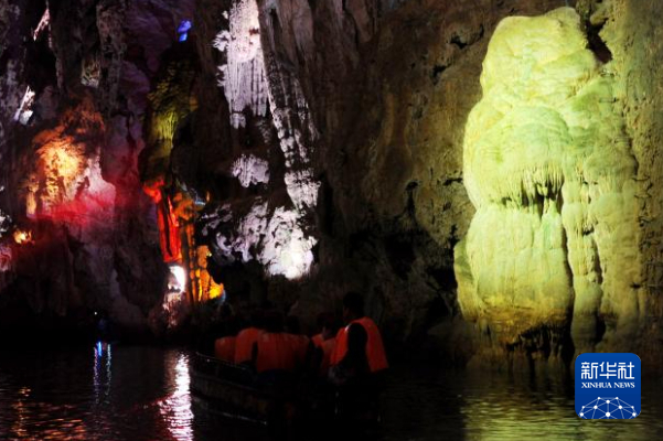 游客在龙宫洞内乘船观赏奇妙的喀斯特景观。新华社记者 陶亮 摄