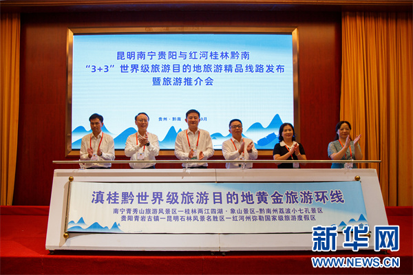 发布会上,六市(州)有关领导共同发布滇桂黔世界级旅游目的地黄金旅游环线,即:南宁青秀山旅游风景区—桂林两江四湖·象山景区—黔南州荔波小七孔景区—贵阳青岩古镇—昆明石林风景名胜区—红河州弥勒国家级旅游度假区。据介绍,黄金旅游环线的发布,将有力推动各个旅游景区资源共享、线路共享、政策共享、客源共享,实现区域旅游共赢发展。
