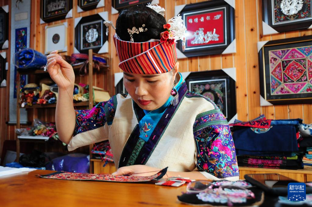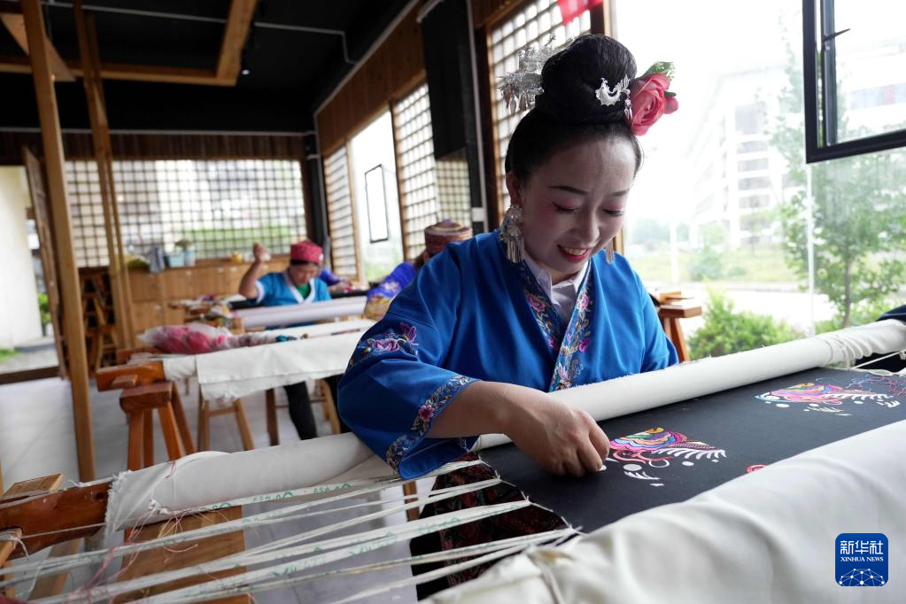 8月25日,绣娘在贵州省黔东南苗族侗族自治州施秉县一家非遗企业苗绣生产车间赶制订单新华社发(王炳真摄)