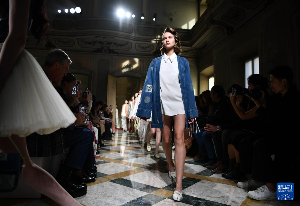 9月24日,模特在意大利米兰时装周上展示含有贵州苗绣元素的设计时装。新华社记者金马梦妮摄