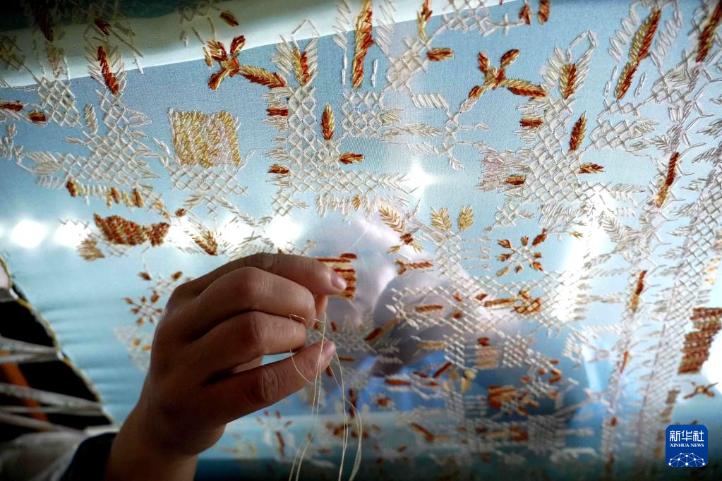 9月18日,贵州省台江县苗族绣娘石传英在制作苗绣。新华社记者胡星摄