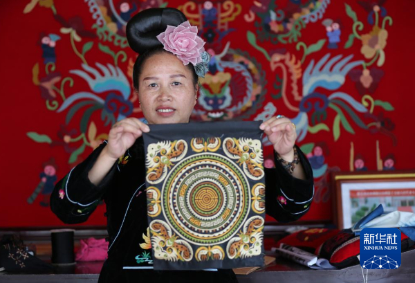 9月27日,苗绣传承人杨阿妮展示她的苗绣作品。新华社发(余天英摄)