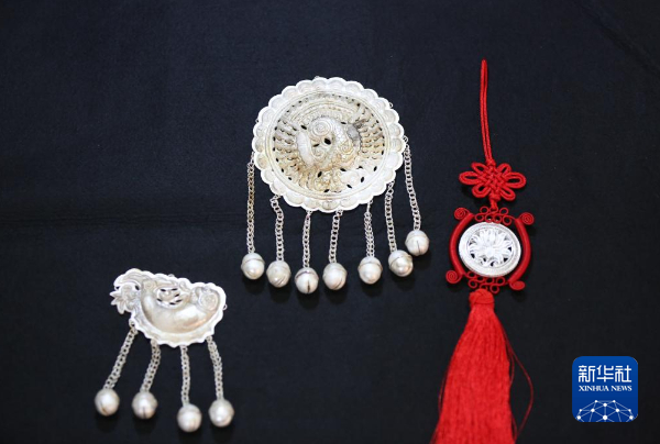 9月27日,国家级非物质文化遗产苗族银饰锻制技艺代表性传承人杨光宾收藏和制作的银饰。新华社发(余天英摄)