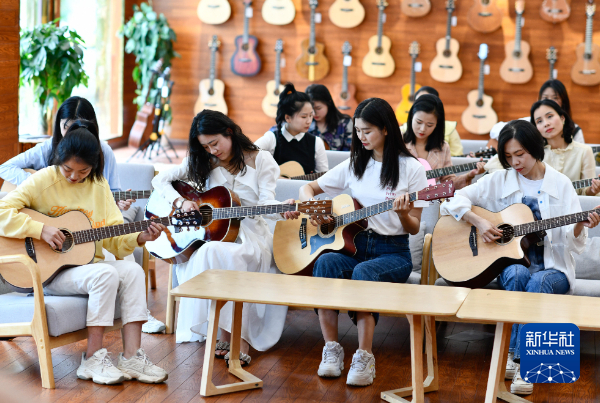2022年5月13日,在贵州省正安县娜塔莎公司吉他文化展厅,当地机关女职工在学习弹奏吉他。新华社记者 杨文斌 摄