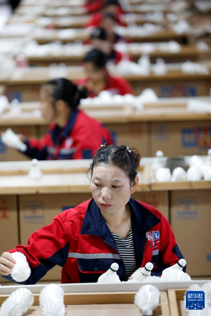 10月7日,工人在贵州省锦屏经济开发区贵州亚狮龙体育文化产业发展有限公司羽毛球生产基地工作。新华社发(杨晓海 摄)