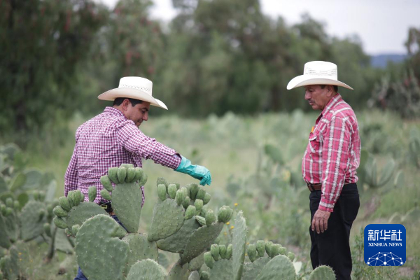 8月3日,在墨西哥墨西哥州,农户阿尔瓦罗(左)和集约化种植专家菲德尔·梅希亚·拉腊(右)察看仙人掌果长势。新华社发(弗朗西斯科·卡涅多摄)