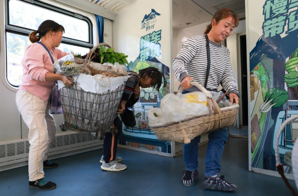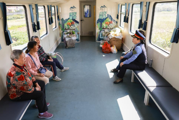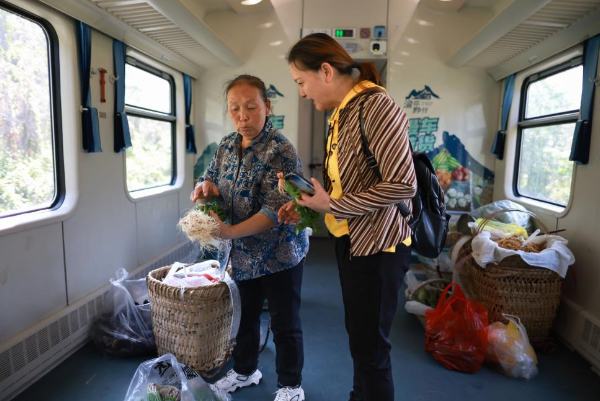 10月17日,沿线村民在5630次列车上售卖农产品。