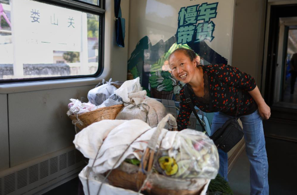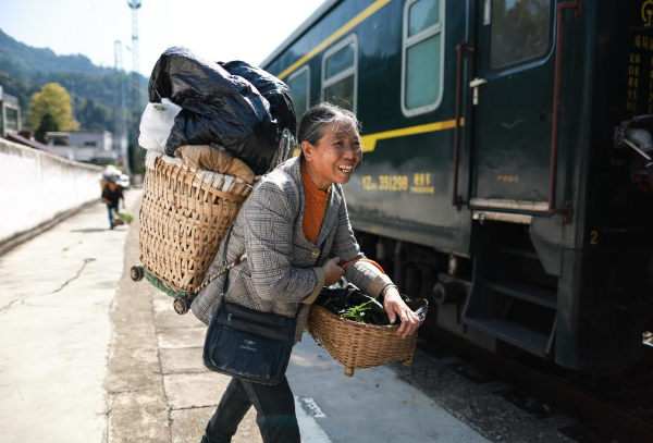 10月17日,村民携带农产品在娄山关站登上5630次列车。