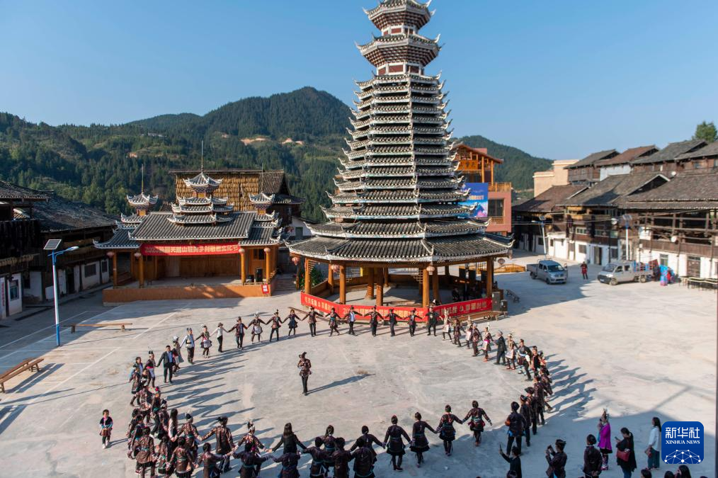 10月22日,侗族同胞与客人在贵州省从江县2023年首届天鹅山最美乡村敬老文化节上演唱侗族大歌跳多耶团结舞。新华社发(吴德军摄)