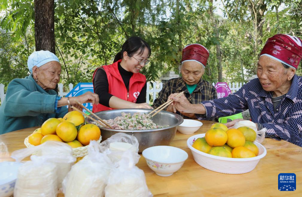 10月22日,在贵州省黔东南苗族侗族自治州施秉县甘溪乡高碑村举办的“孝亲敬老·浓情重阳”活动中,志愿者与老人们一起包饺子。