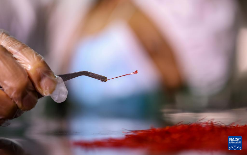 10月31日,技术人员在玉屏侗族自治县朱家场镇混寨村西红花种植基地检查烘烤之后的西红花花丝质量。新华社发(胡攀学 摄)