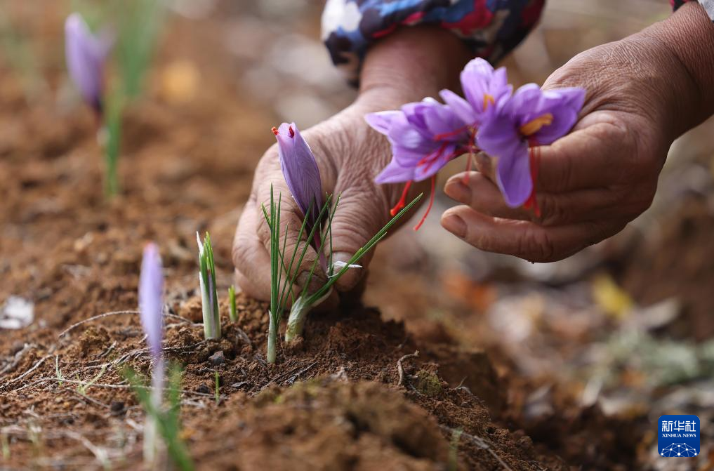 10月31日,村民在玉屏侗族自治县朱家场镇混寨村西红花种植基地采收西红花。新华社发(胡攀学 摄)
