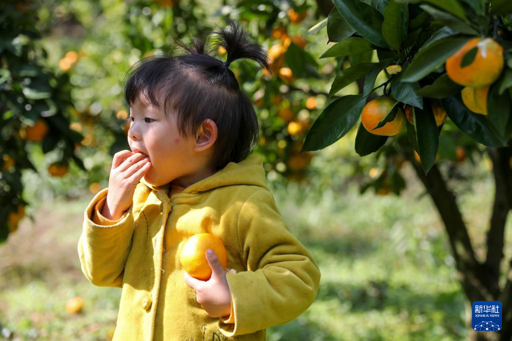 11月1日,一名小朋友在贵州省开阳县南龙乡土香村柑橘种植基地品尝柑橘。新华社发(袁福洪摄)