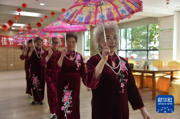“走秀队”的高龄老人们在贵阳市观山湖区养老服务中心里排练节目。新华社记者 李凡 摄
