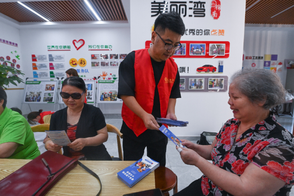 志愿者向社区老年人发放防诈骗宣传资料 徐昱 摄