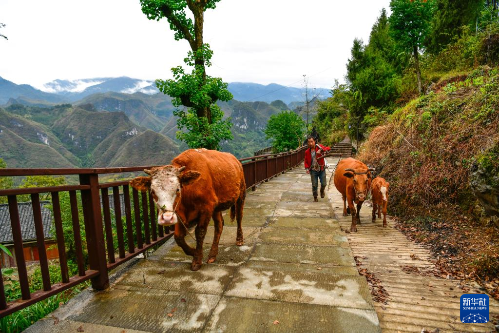 11月15日,贵州省石阡县国荣乡楼上古寨的村民放牛归来。新华社记者 杨文斌 摄