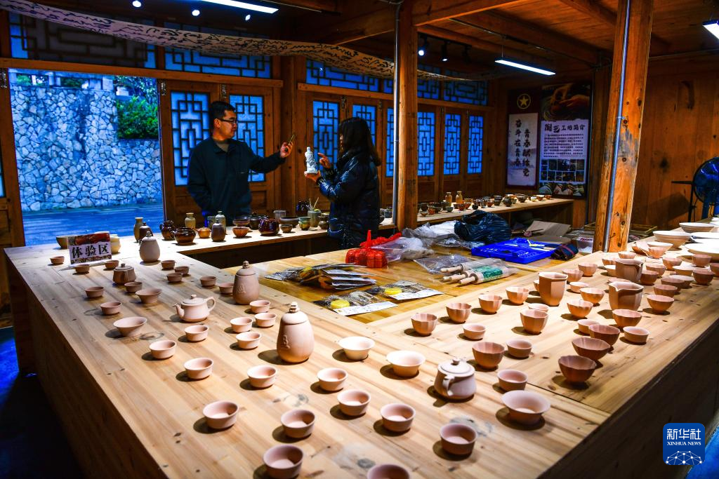 11月15日,帮扶干部在贵州省石阡县国荣乡楼上古寨的文创工坊里拍摄陶艺制品。新华社记者 杨文斌 摄