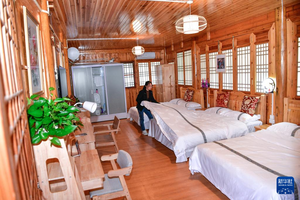 11月15日,贵州省石阡县国荣乡楼上村的村干部在整理民宿床铺。新华社记者 杨文斌 摄