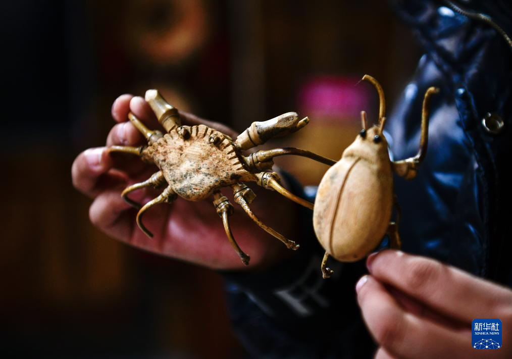 11月15日,帮扶干部在贵州省石阡县国荣乡楼上古寨的文创工坊里展示竹雕工艺品。新华社记者 杨文斌 摄