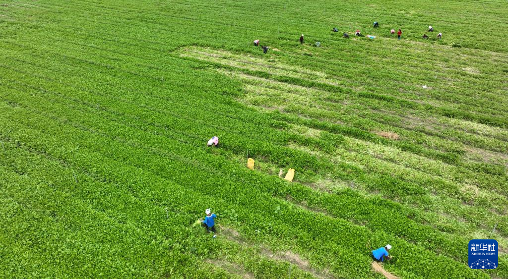 11月18日,村民在贵州省黔东南苗族侗族自治州榕江县车江万亩大坝采收菜苔(无人机照片)。新华社发(袁福洪 摄)