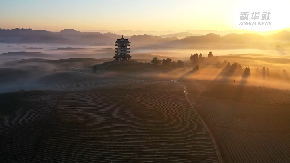 近日,贵州省湄潭县的中国茶海景区出现美丽的晨雾景观。配合着朝阳的光照,在朦胧的雾气中若隐若现的万亩茶海,宛如一幅令人赏心悦目的水墨画。