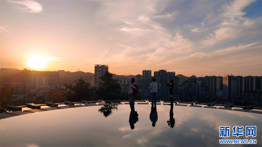 11月28日,游人在泉湖公园空山止水景点拍摄夕阳(手机照片)。新华网 黄勇 摄