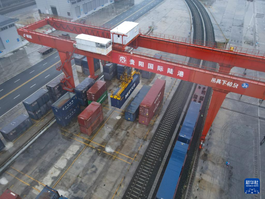 11月30日,一列中欧班列在贵阳国际陆港都拉营站装载集装箱(无人机照片)。新华社记者 刘续 摄