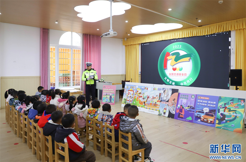12月1日,在贵州省黔东南苗族侗族自治州丹寨县第二幼儿园,丹寨县公安局交通警察大队民警向小朋友讲解交通安全知识。新华网发(陆德华 摄)