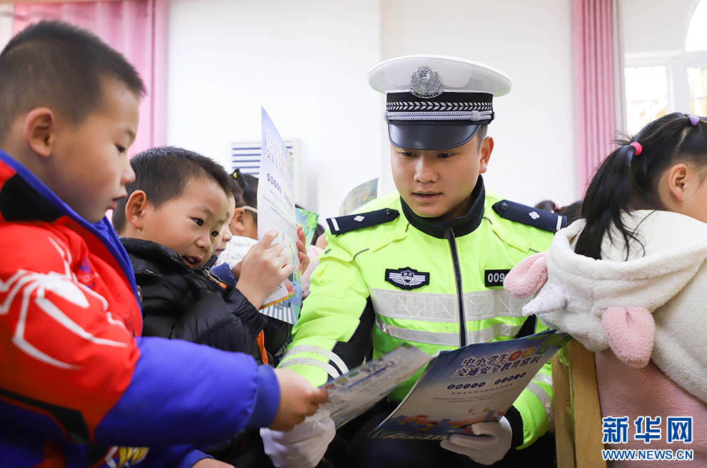 12月1日,在贵州省黔东南苗族侗族自治州丹寨县第二幼儿园,丹寨县公安局交通警察大队民警向小朋友们发放交通安全宣传资料。新华网发(陆德华 摄)