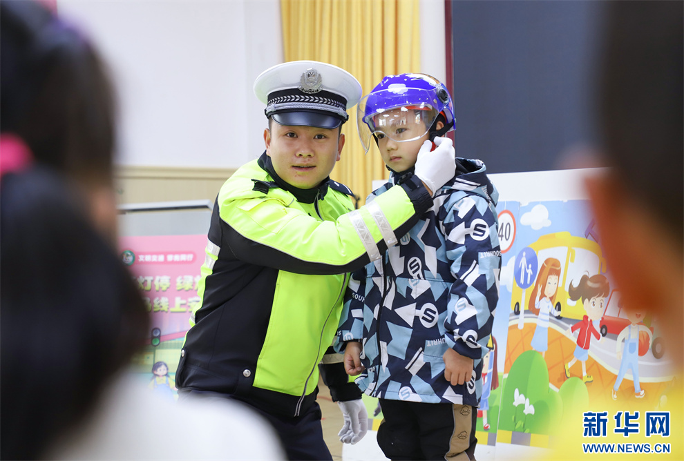 12月1日,在贵州省黔东南苗族侗族自治州丹寨县第二幼儿园,丹寨县公安局交通警察大队民警指导小朋友正确佩戴安全头盔。新华网发(陆德华 摄)