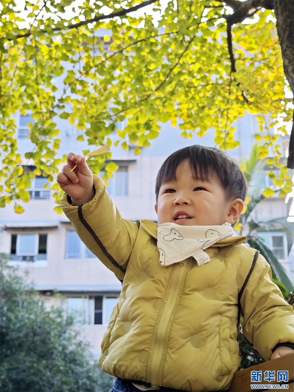12月4日,在赤水市金华街道滨东社区银杏广场,小朋友玩银杏叶。新华网发(张浪摄)