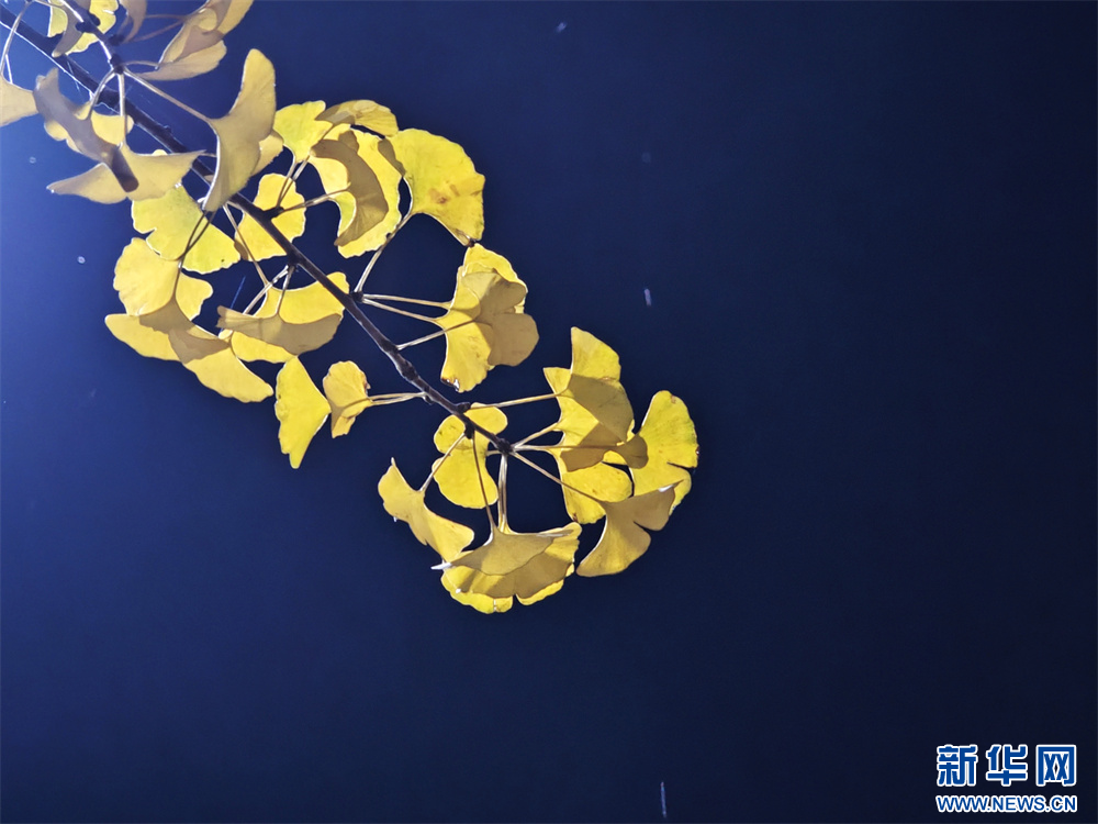 12月4日,在赤水市市中街道,银杏叶借着路灯的光,展现出不一样的美。新华网发(张浪摄)