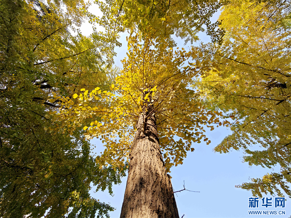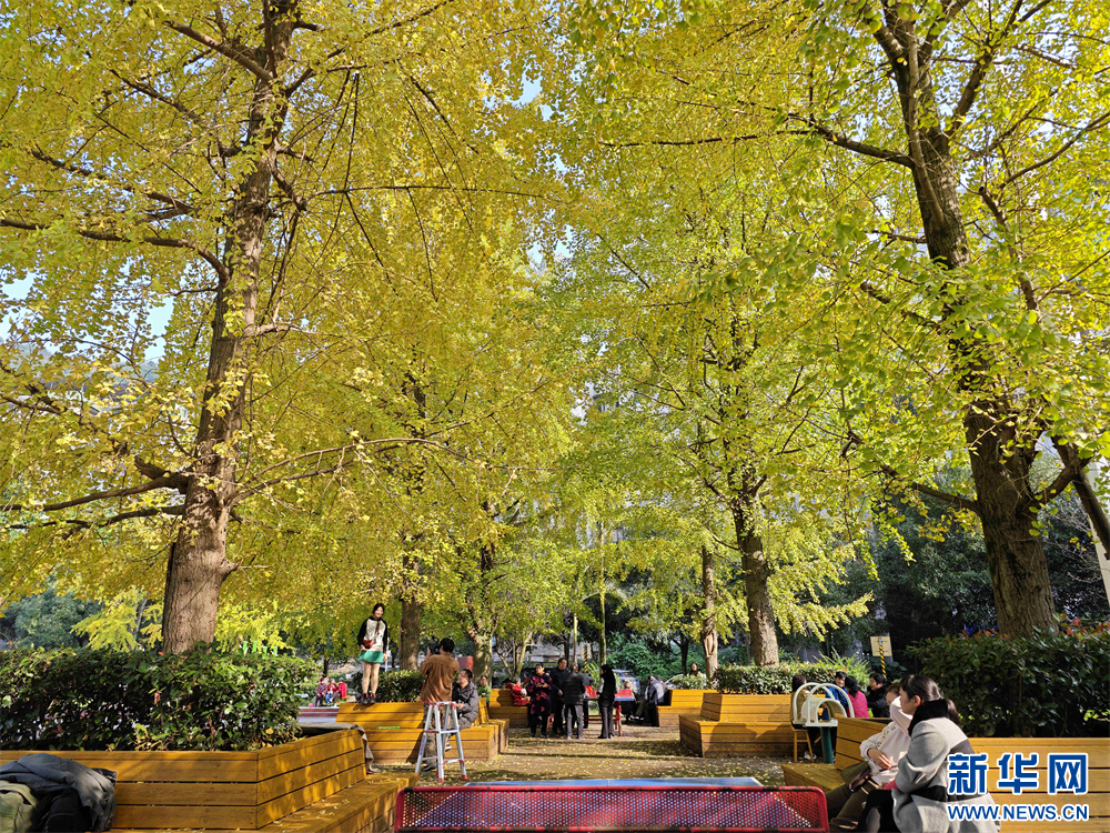 12月4日,在赤水市金华街道滨东社区银杏广场,冬日暖阳下,银杏正“换装”。新华网发(张浪摄)