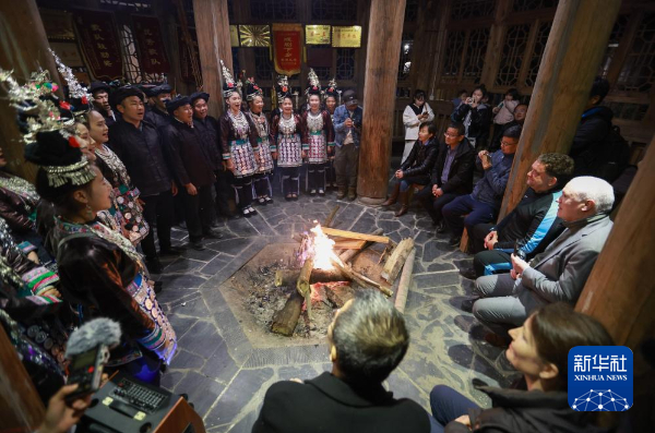 12月11日,榕江县少数民族同胞用歌舞欢迎“学转英超”培训团队。新华社记者 刘续 摄