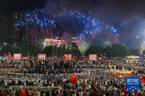 这是7月29日拍摄的“村超”比赛结束后的焰火表演。新华社记者 刘续 摄