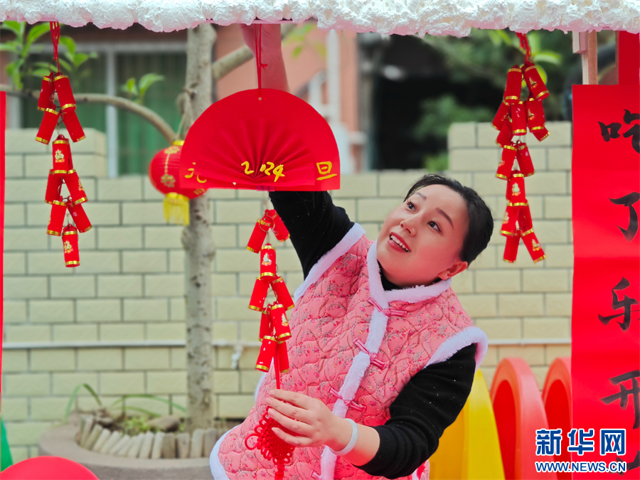 12月29日,在赤水市市中幼儿园,老师布置迎新活动现场。新华网发(张浪 摄)