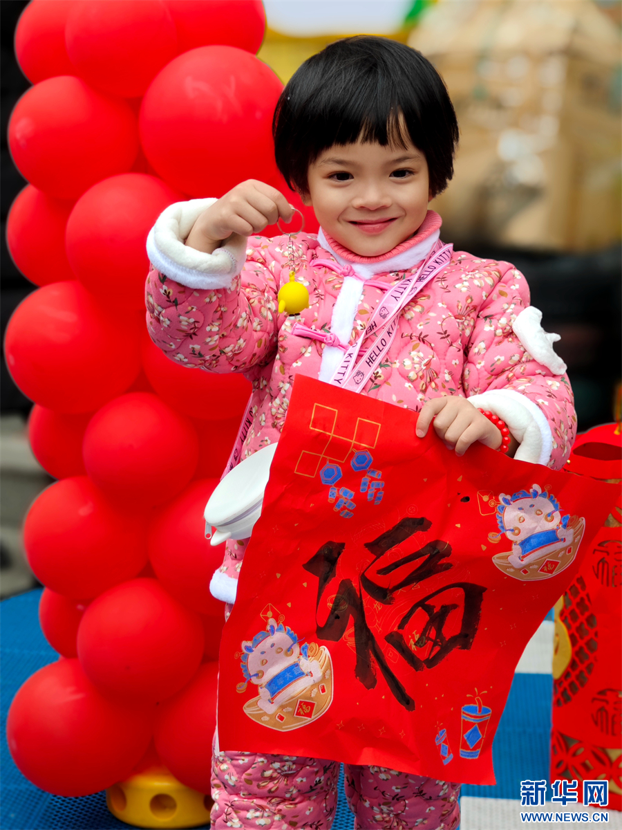 12月29日,在赤水市市中幼儿园,幼儿和福字合影,迎接新年到来。新华网发(张浪 摄)
