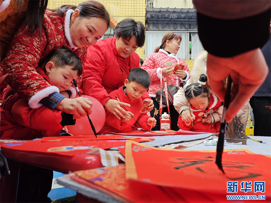 12月29日,在赤水市市中幼儿园,亲子体验写对联,一起迎接新年。新华网发(张浪 摄)