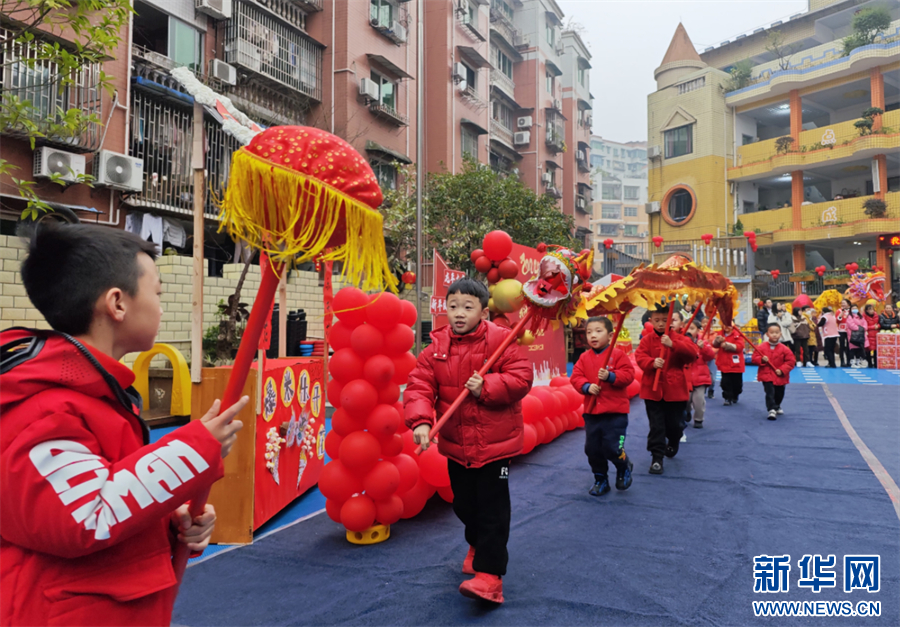 12月29日,在赤水市市中幼儿园,幼儿通过舞龙迎新年。新华网发(张浪 摄)