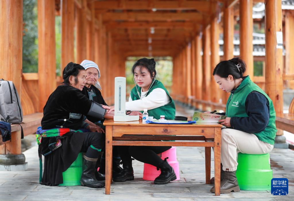 1月2日,在贵州省黔东南苗族侗族自治州从江县刚边壮族乡刚边村,家庭医生为村民测量血压。