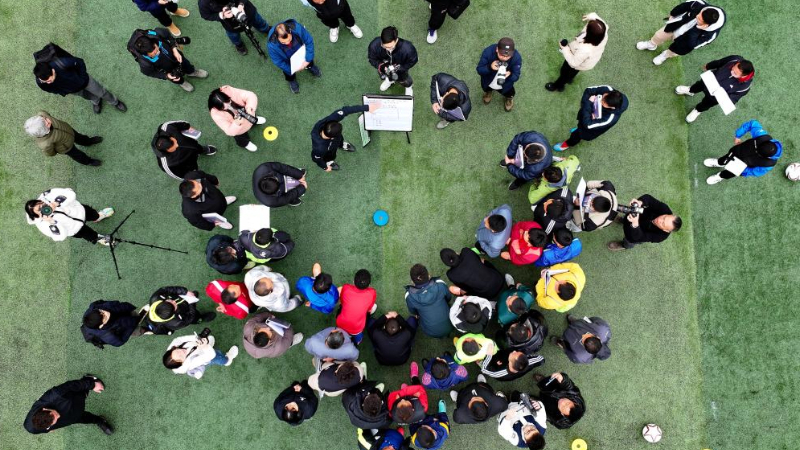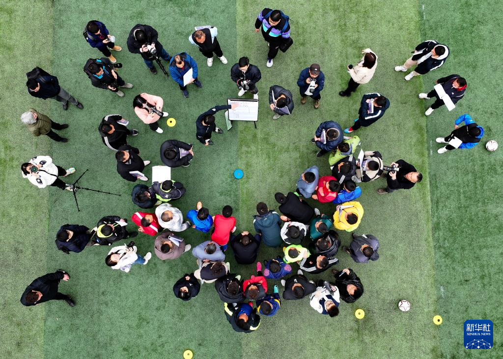 学员参加“学转英超”基层足球教练培训项目(无人机照片)。新华社记者 刘续 摄