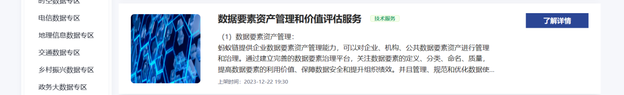 近日在贵阳举行的“新要素 新资产 新发展——数据资产价值共创主题论坛”上,“蚂蚁数科数据服务专区”上线运营,标志着蚂蚁集团数字科技与贵阳大数据交易所深度合作,打造新型数据专区模式拉开序幕。