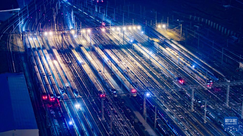 这是1月25日凌晨在贵阳北动车所拍摄的动车组列车(无人机照片)。新华社记者刘续摄