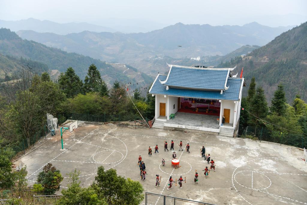 ↑2023年2月16日,贵州省从江县西山镇中寨教学点学生练习瑶族长鼓舞。