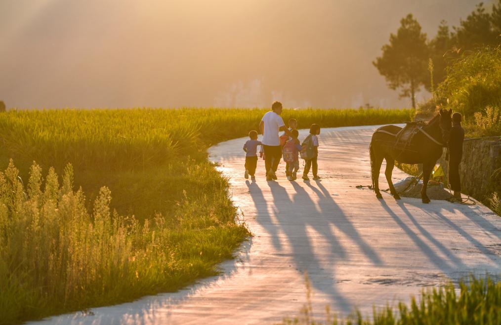 夕阳西下,远山苍茫。陆成文护送着路远的孩子们回家,秋日暖阳照在金色的稻田上,也照亮了师生身影。透过民居的两堵墙,构成自然的相框,我按下了快门,记录下乡村黄昏最美的模样。