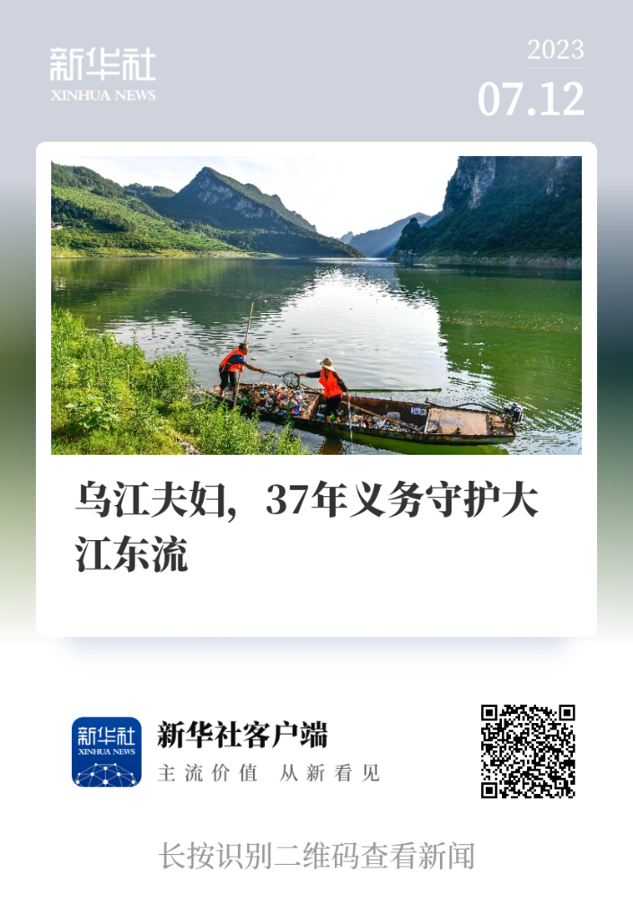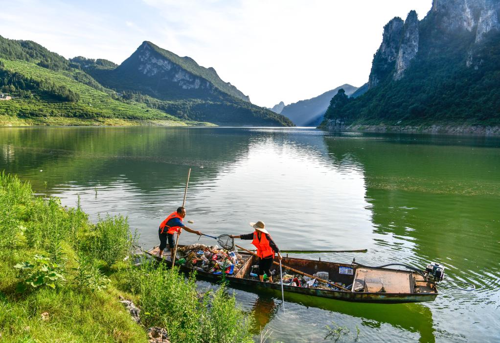 ↑贵州省瓮安县珠藏镇丰岩村村民卢锡永和妻子驾驶小船在乌江上打捞漂浮物(2023年7月10日摄)。