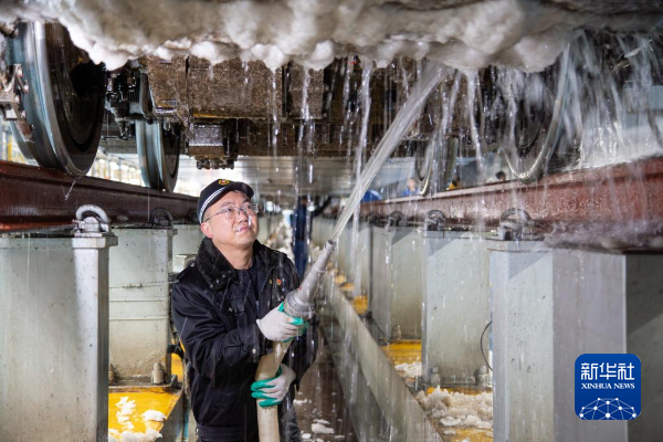在山东青岛北动车所,机械师刘伟民用温水清除列车下的积冰:“动车组运行在山区或气温较低的区段,未融化的积雪及雨水会附着在动车组走行部导致结冰。我和同事会根据需要增加排班,保障列车安全。”
